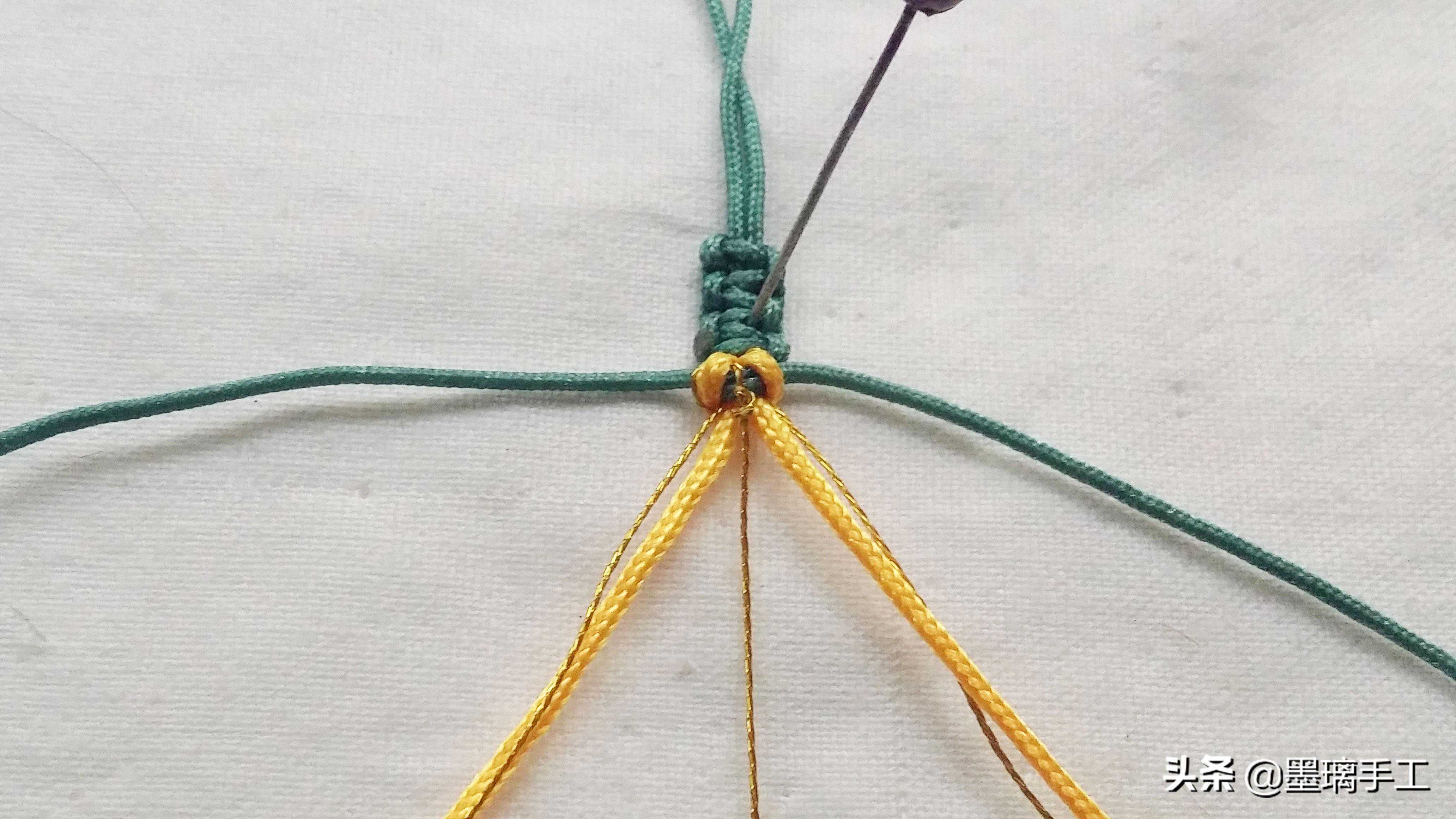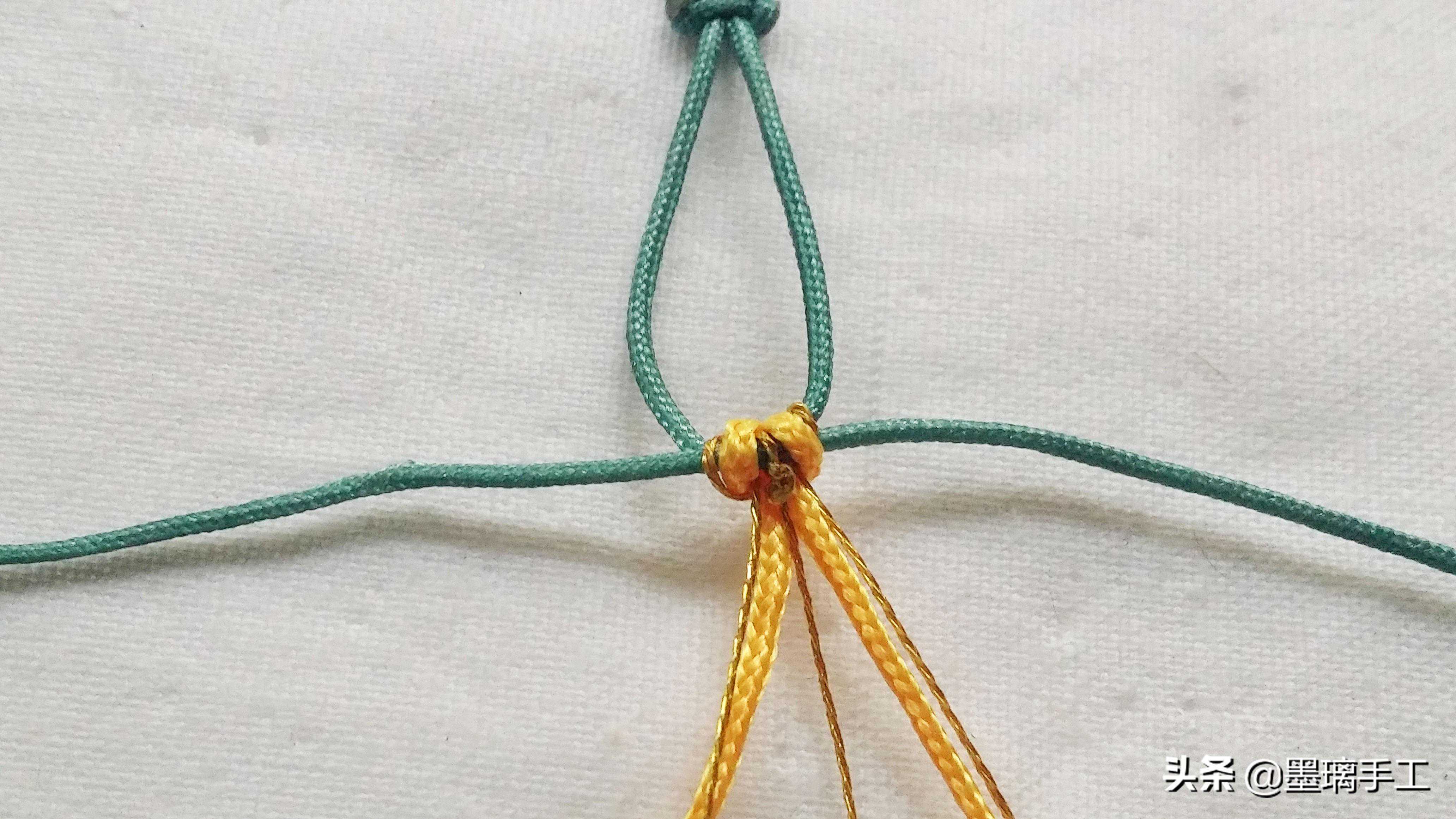 9.左边蓝绿色线做轴线,金丝做绕线,编半个雀头结。黄色线做绕线,编半个雀头结。右边的蓝绿色线做轴线,金丝做绕线,编半个雀头结。黄色线做绕线,编半个雀头结。如图: