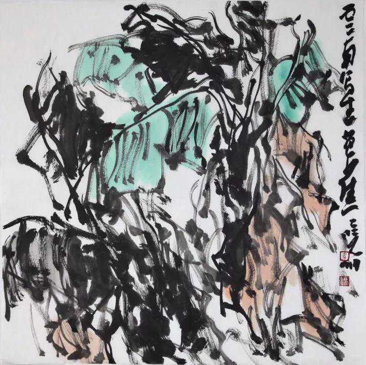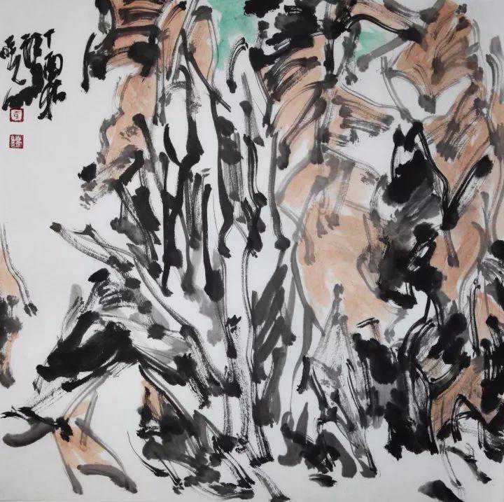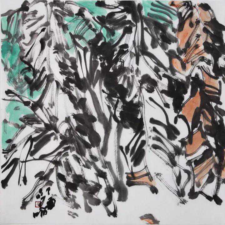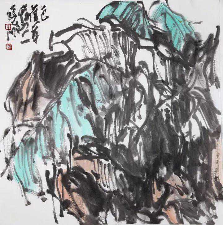 李晓明在他的水墨中所以能够表现出这样一种生命境界,根源于两点:一是他本人在艺术追求中不期然地流露出的那种顽强不息的奋斗精神——植物所具有的那种蓬勃向上的生命意象实际上就是画家本人的精神折射;二是画家找到了表达生命意象的渠道和方法。纵观近年一些中年画家在水墨语言的探索中所呈现出的足迹,可以看到,他们都各有自己的语言路径。如果我们可以把范扬的语言特征概括为飞动的“笔势”,把周京新的语言特征概括为平列的“笔序”,把田黎明的语言特征概括为色墨并用的“色韵”,那么,李晓明的语言特征就是“笔韵”。所谓“笔韵”,就是他在运笔中自然生成的一种韵致。正是这种具有连贯性的和音乐感的韵致,使他的笔墨总是处在一种有序的动态之中。钱钟书曾这样解读“气韵生动”:“气韵,生动者也。”正是在这种动态化的笔墨之中,才幻化出一种勃发峥嵘的生命意象。