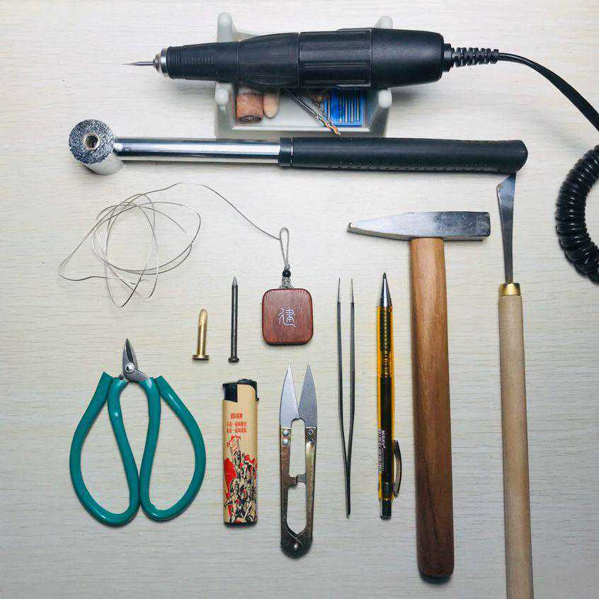 0.7mm的银丝;木块;铅笔;打火机;短嘴剪刀;世新雕刻机+0.5mm球刀,1.8mm麻花钻头,砂纸轮,羊毛轮;opi抛光板;前段时间做的小锤子(传送门:4块钱的小锤子,换个缅甸花梨木柄)美工刀;钢钉……差不多就这些。