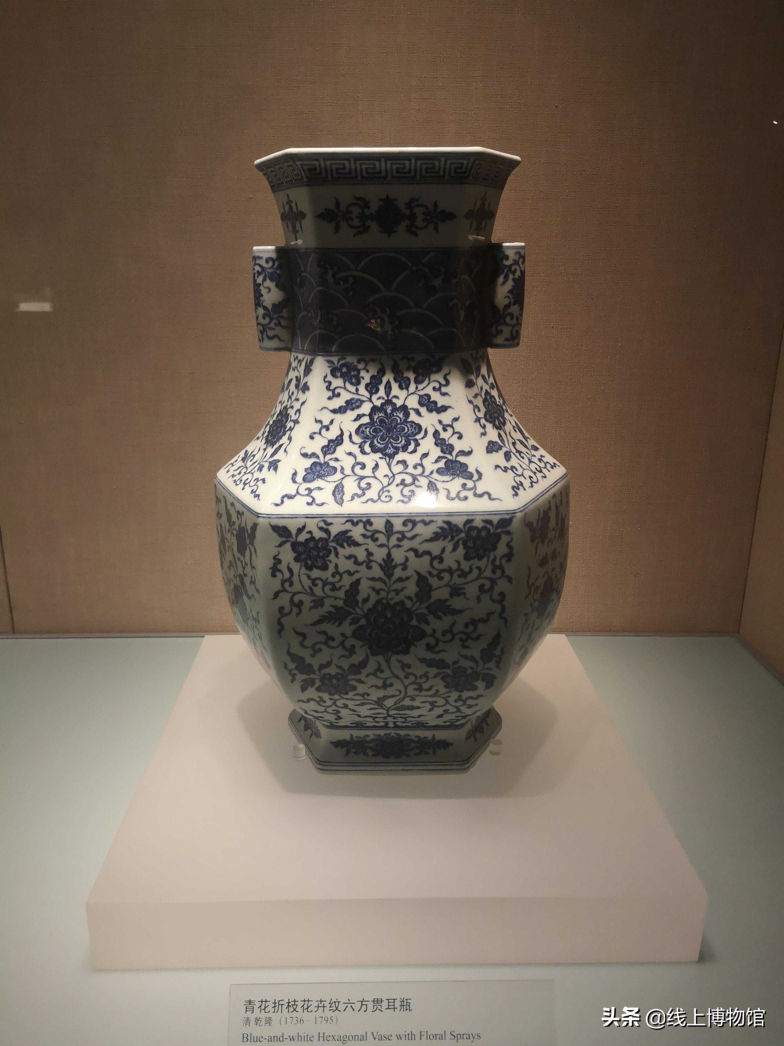清-乾隆青花缠枝花卉纹六方贯耳瓶