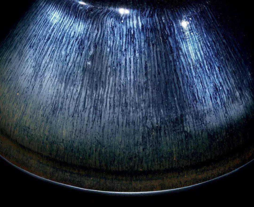 集中打白光之后可见到银色毫纹,略泛蓝光,内壁的毫纹表现比外壁略好一些,分界不是很清晰,也不够直,内壁釉面有一小处瑕疵,对成交价影响较大。
