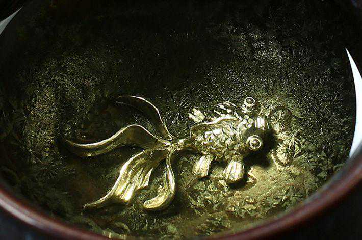 茶杯内底饰有银质金鱼一条,生动精巧,盛满茶汤时,金鱼呈金黄色,通体透亮,非常美观;外底承假圈足,足心浅挖,足际稍宽,修足规整。