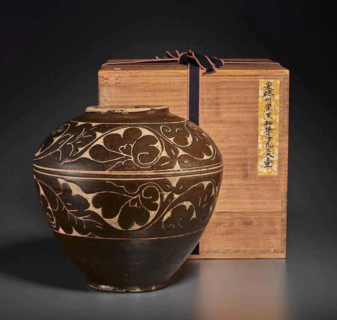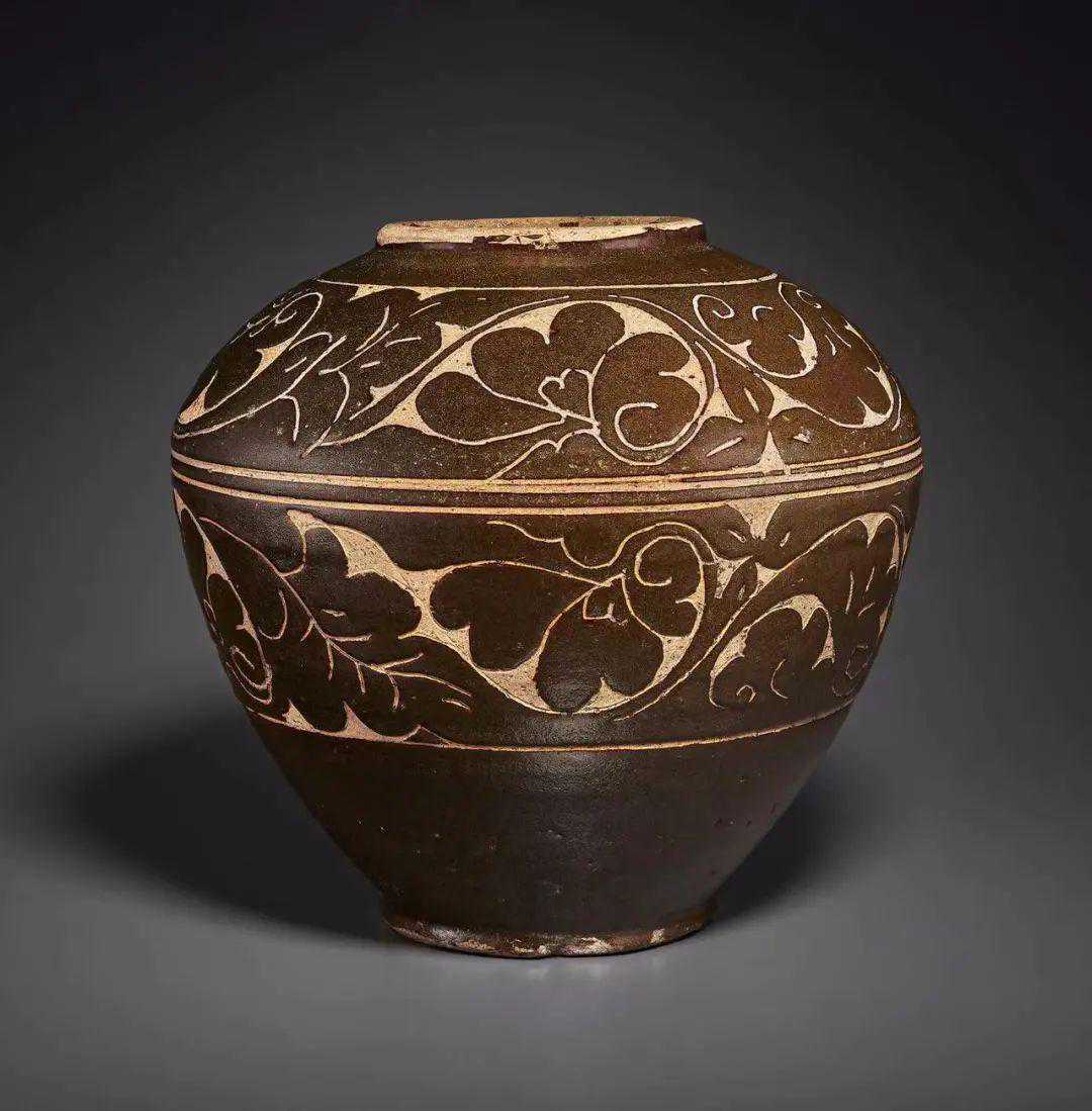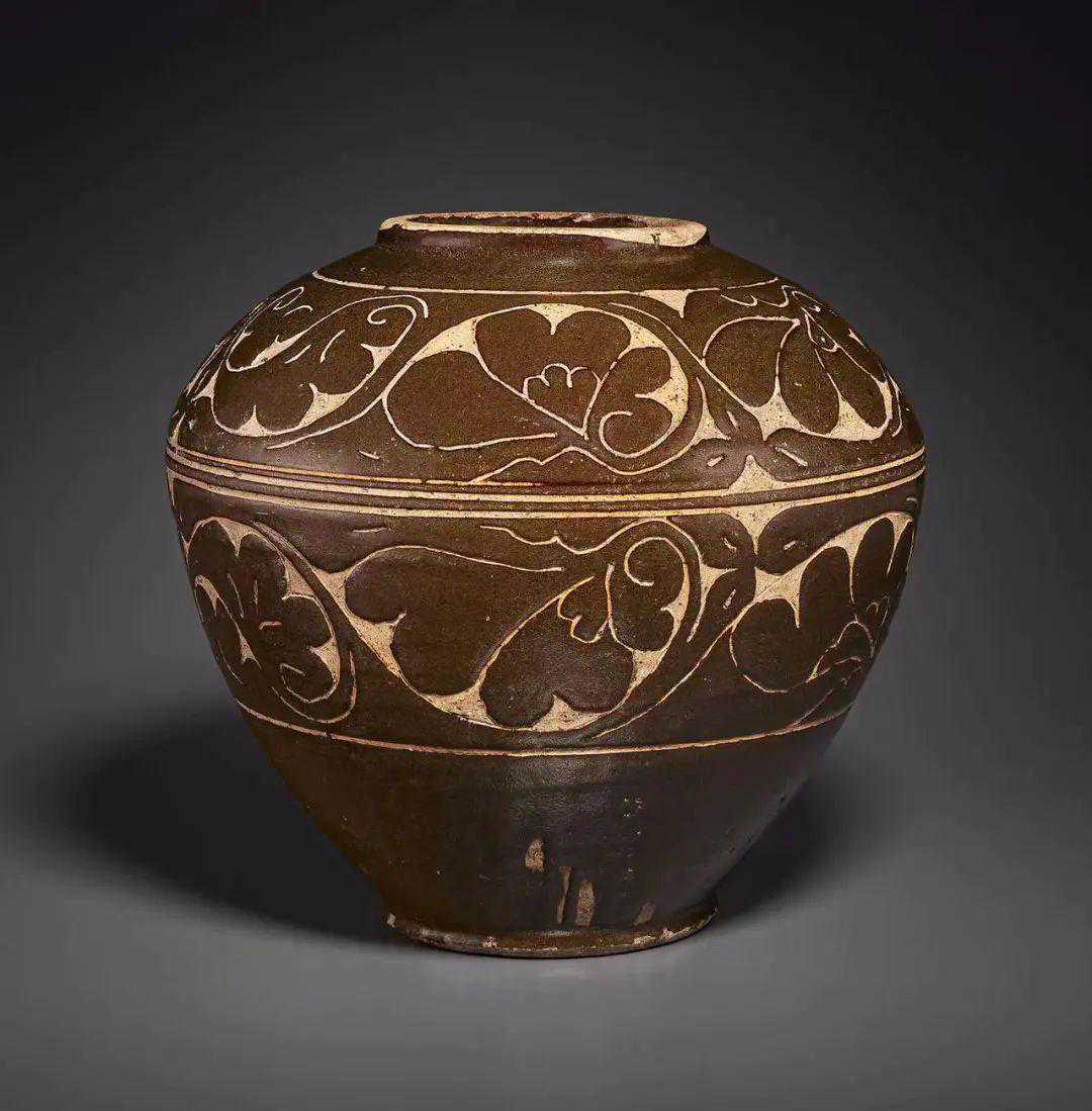 金-元十三-十四世纪磁州窑黑釉卷草花卉纹罐