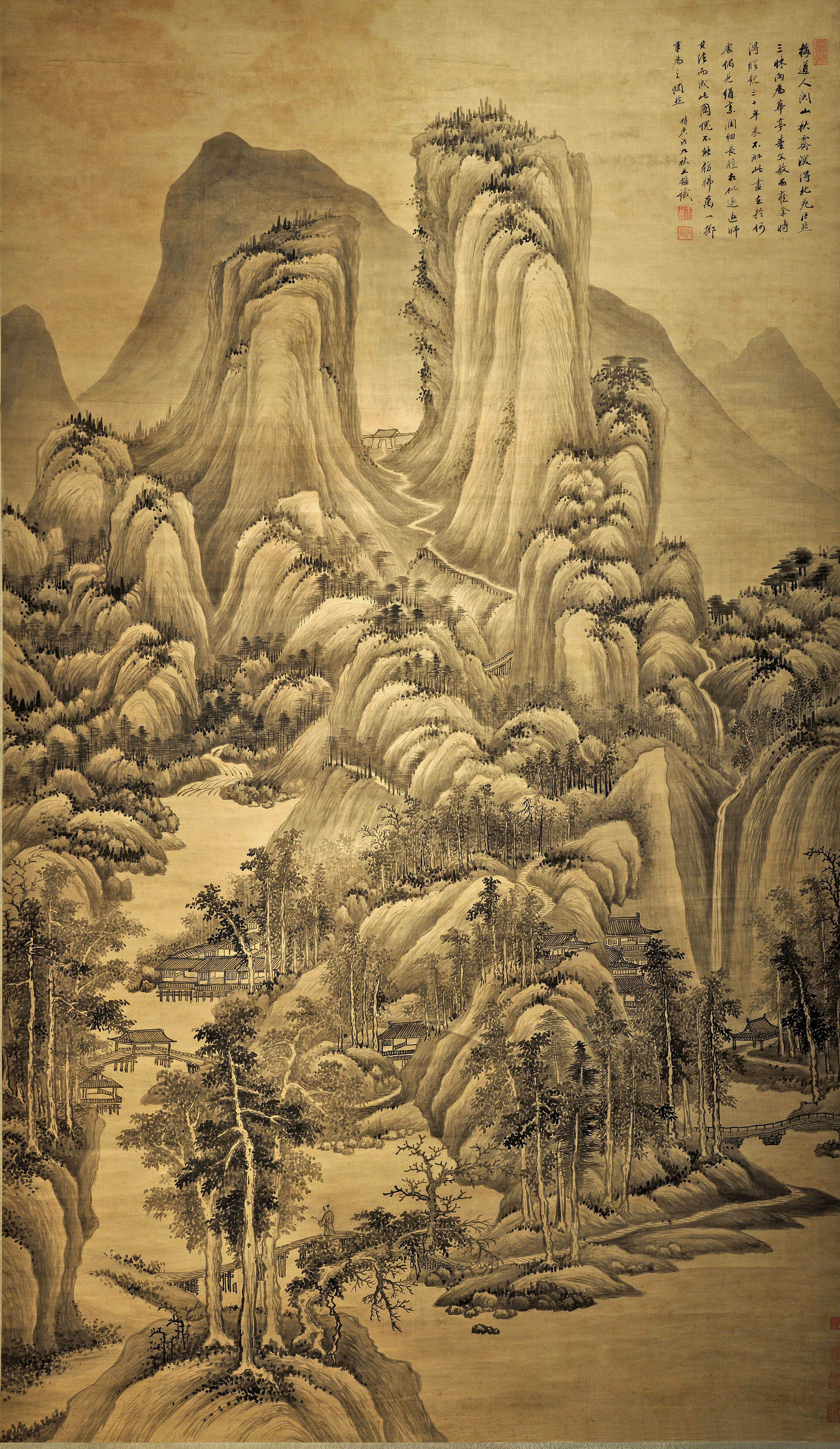 绘群山连绵,山峰高耸入云,山上松树成林,高大茂盛;山脚下房屋隐现,人影绰绰,泉水潺潺,秋景宜人。技法上,皴染浑穆,层峦叠障,气韵深沉。用笔纯用中锋,谨严厚朴,气魄雄厚。此图笔墨幽微,拟元代大画家王蒙的风格,有一种空幻的感觉,令人有悠然远隔尘嚣之想。
