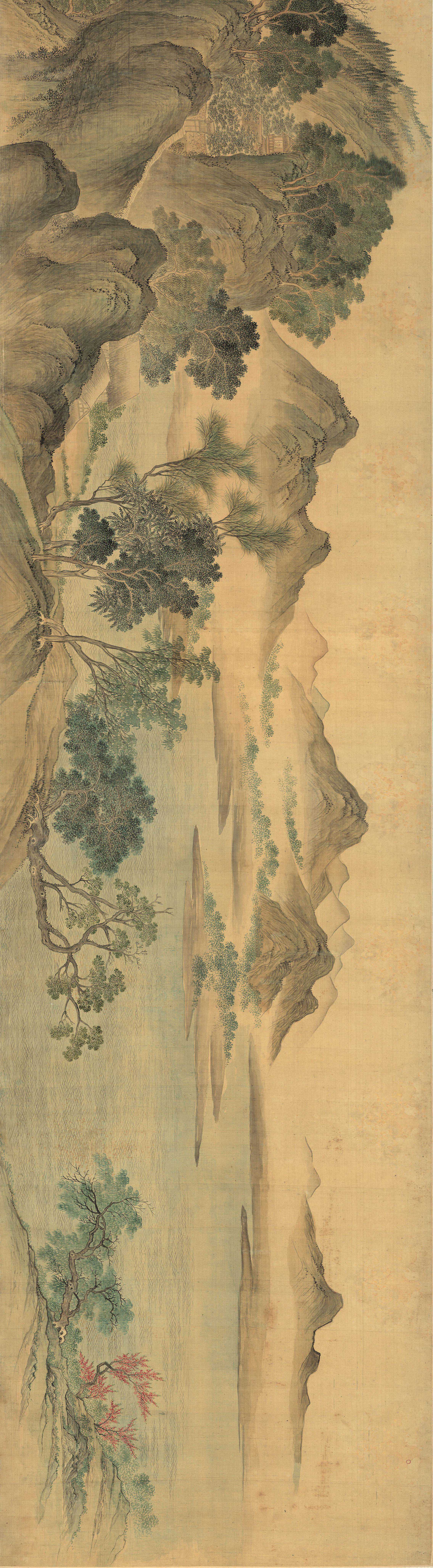 图绘烟云浩渺、林木葱郁的雨后山景。此图深得黄氏“浅绛”的画风。其笔法松秀灵动,色、墨富于变化而有层次,重叠交错的墨点更是将山形树貌有机地统一于高逸的境界之中。