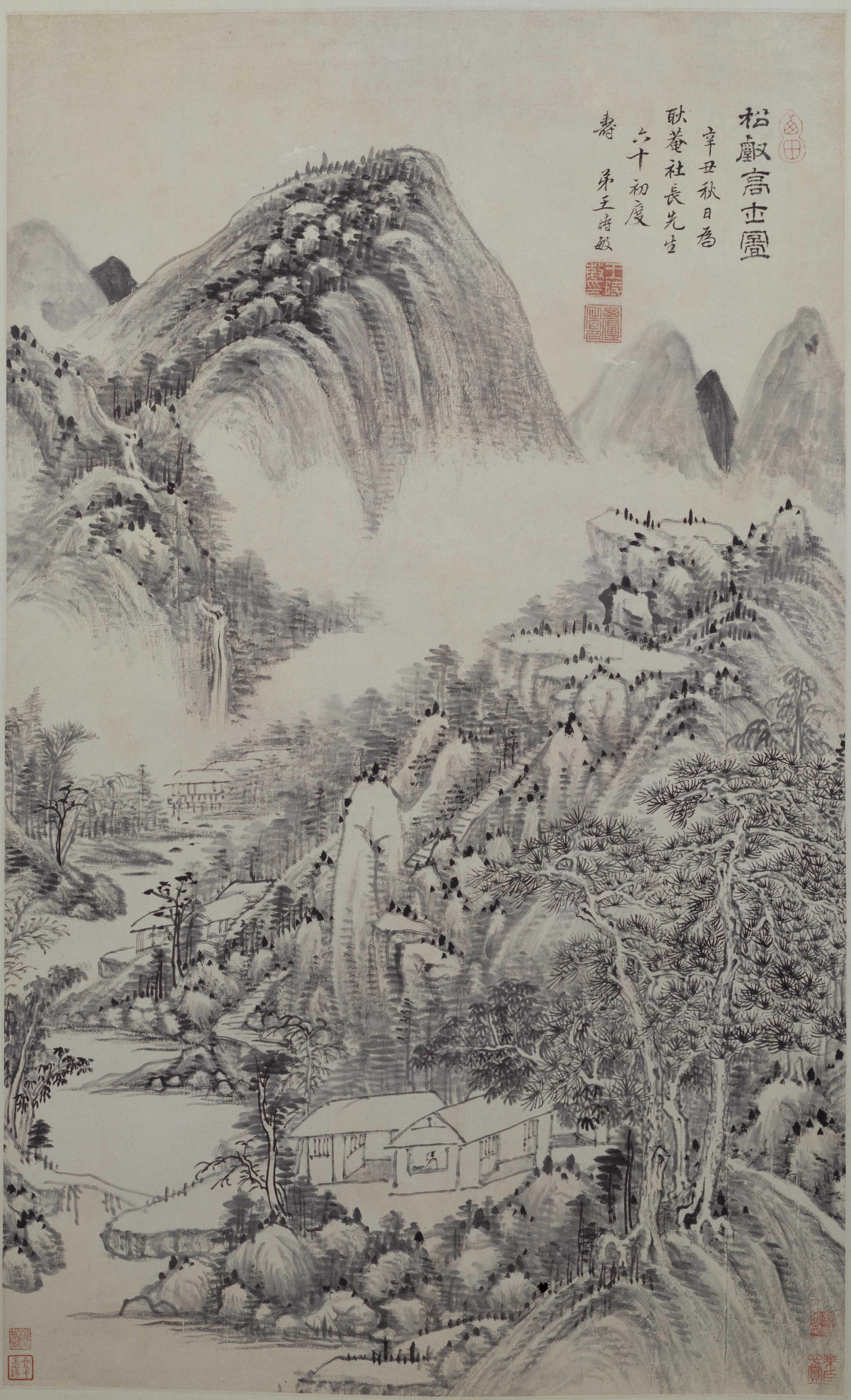 此幅构图为王时敏所作之常见格局,峰峦叠嶂,林木丛生,溪流小桥,屋舍隐现,一派江南的山水景象。用笔古秀,布局深远,以披麻皴写山石,浓墨点苔,意境近黄公望,为王氏代表作。