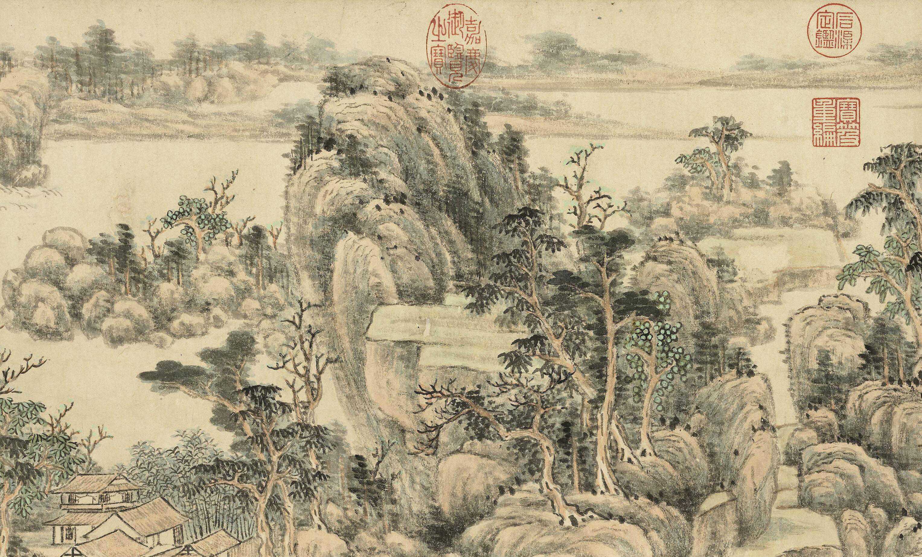 此图绘烟雨濛濛中牧童驱犊返家,临溪水阁高士观泉,一派江南胜景,正是僧巨然笔下熟悉之景。