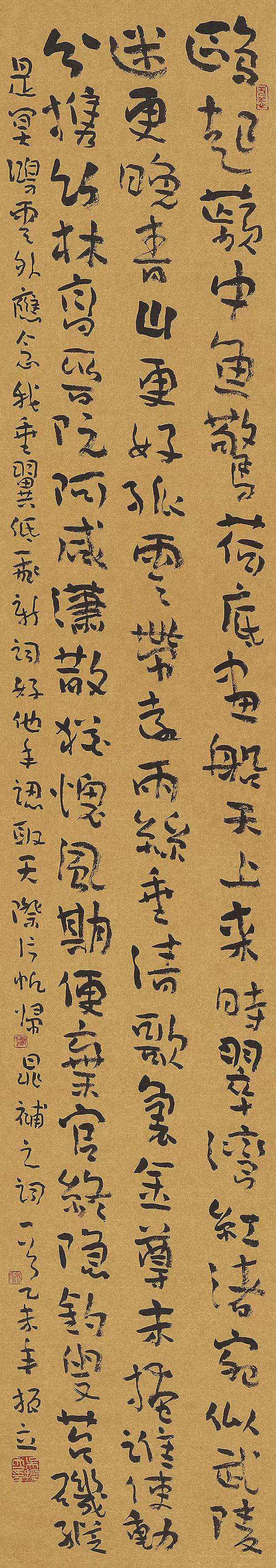简言之,先生的字里,至少透露出这样几个方面的消息:其一,从容、淡定、自信、倔强,这是他的人生态度;其二,雍容、含蓄、高蹈、华贵,这是他的艺术信念;其三,自由、烂漫、宽厚、悠然,同时也有意无意地躲避着时髦和所谓主流,这是他当下的生命状态和属于自己的艺术观、价值观。先生自谓其书法受颜真卿、八大、金农和林散之影响最大,细细比较,不难看出先生于经典大师的取向是十分鲜明的。颜真卿倔强激烈于表而烂漫宽厚于里,八大笔墨冷寂落寞而心性华贵高蹈,金农行状看似自由不羁实则冷眼深情,而林散之以曼妙灵动的点画线条参悟佛事抟虚真境。他们的艺术就是他们的人生,他们是踏踏实实行走在大地上的。颜真卿不是床明净几、笔墨精良而是歌哭劳顿、出生入死,八大不是肥马轻裘、觥筹交错而是隐姓埋名、吟啸孤寂,金农不是以尺论价、日进斗金而是“和葱和蒜卖街头”,林散之不是前呼后拥、大师泰斗而是默默念佛年近八旬始为人知。他们没有别的选择,所以只能义无反顾。