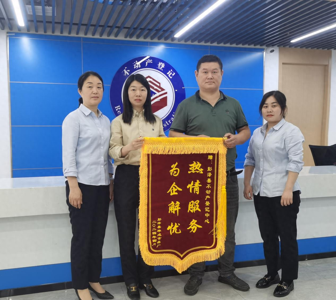 彭泽县不动产登记中心聚焦企业群众“所困所需”,持续优化营商环境,不断提升涉企服务质效。2024年4月22日,彭泽县毕成食品厂将一面写着“热情服务,为企解忧”的锦旗送到了县不动产登记中心,感谢中心热情周到的服务。