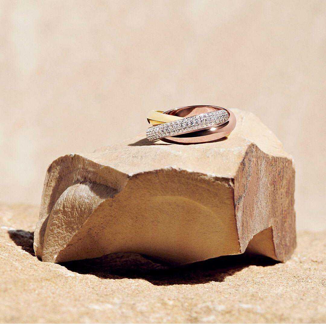 三枚环圈,三种颜色。三色K金紧紧相扣,交汇融合在一片和谐与神秘之中。路易・卡地亚(LouisCartier)先生于1924年设计出这枚划时代的Trinity三色金戒指。