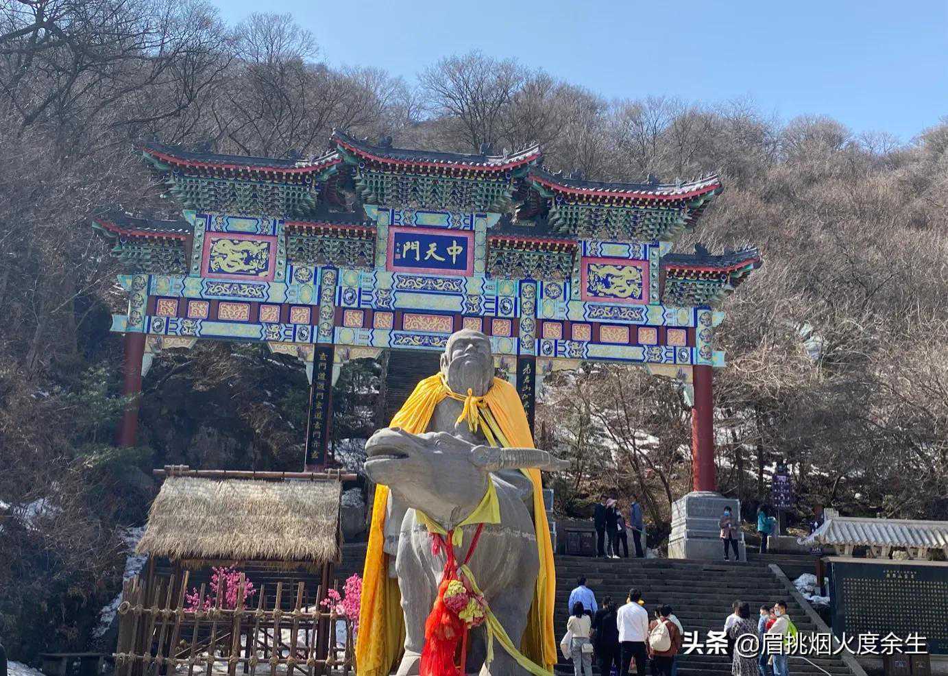 下了索道就到了中天门,中天门前有老子骑牛像,传说老子传《道德经》后,骑着青牛而去。唐贞观十一年(637年),唐太宗派尉迟敬德重修景室山铁顶老君庙,并赐名为“老君山”。
