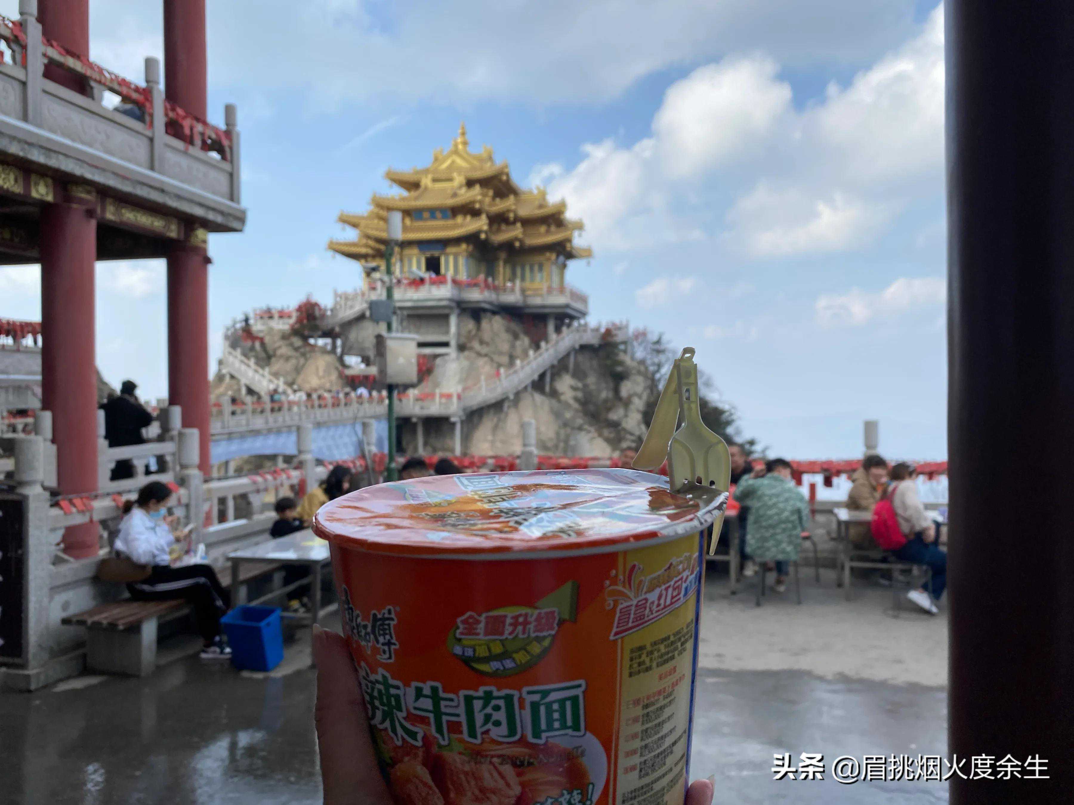 转一圈是不是累了?坐在这里看着金顶,吃一碗泡面,体会那句“远赴人间惊鸿宴,一睹人间盛世颜……”