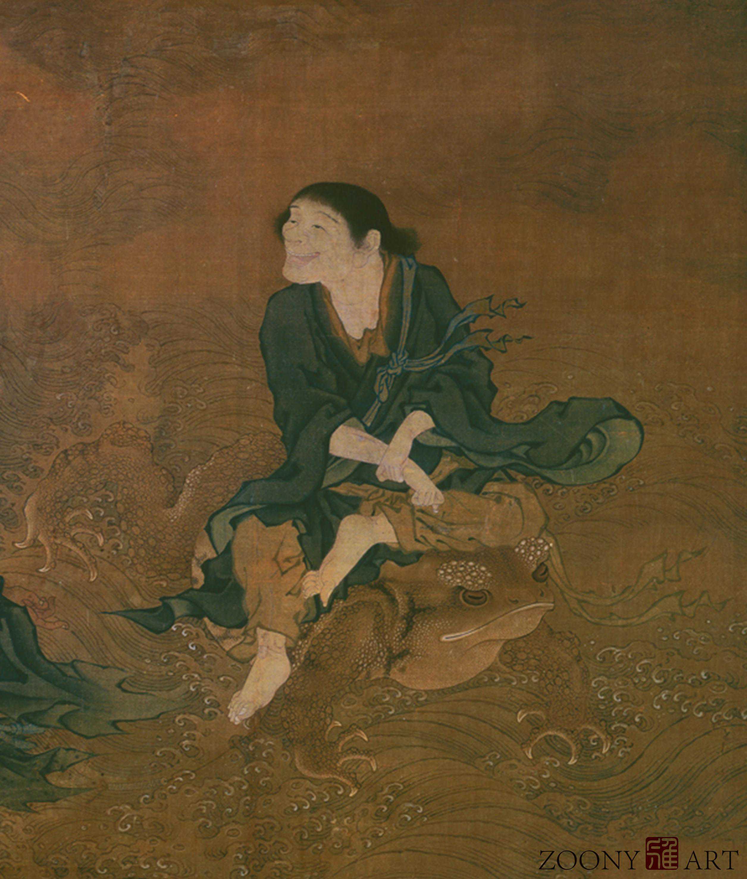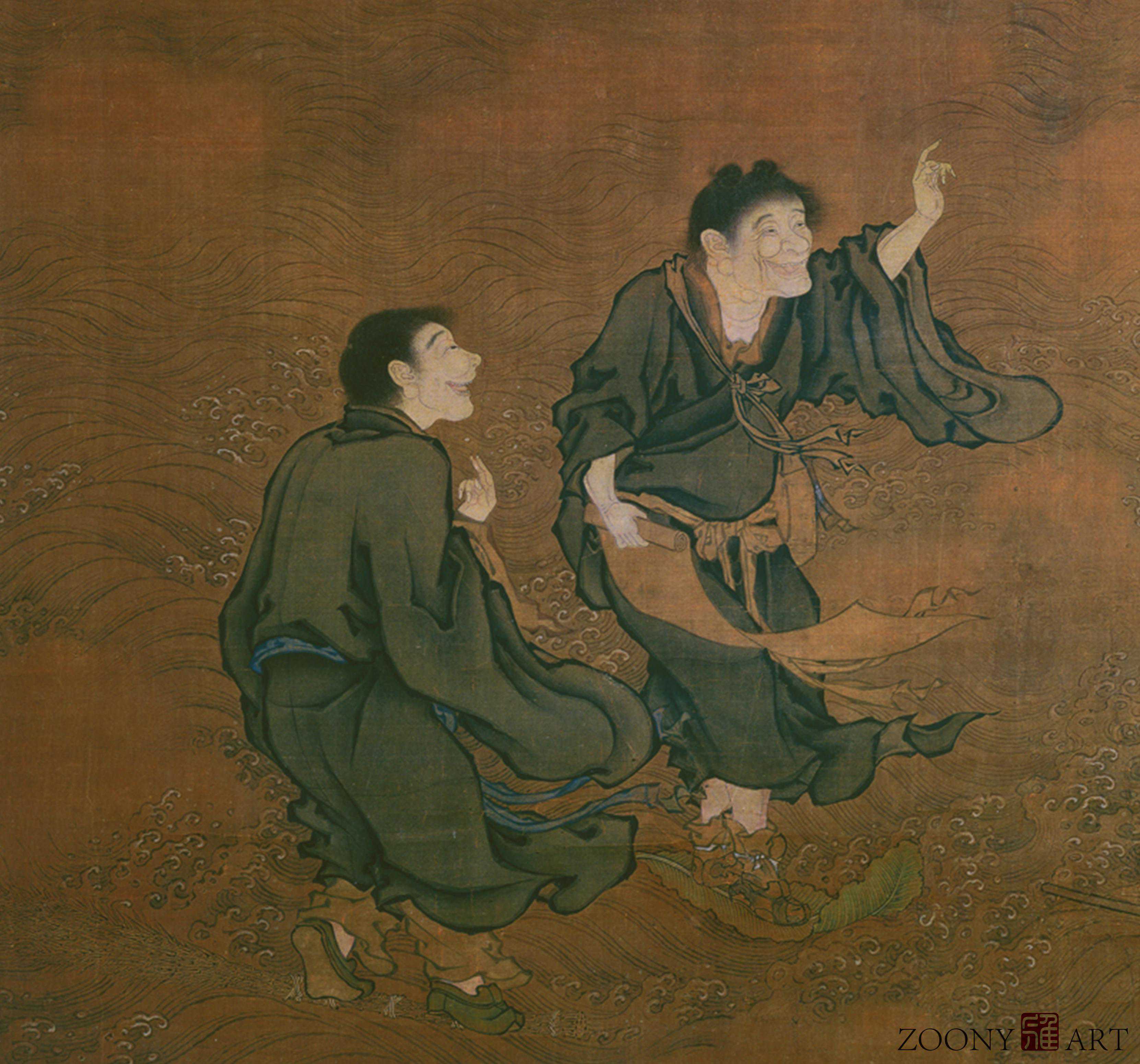 作者对画面进行了精心的设计,从画中可看出四位神仙都面带微笑,张着大嘴,注视着天上跨鹤飞翔的寿星--南极仙翁。刘海坐在金蟾上,望着对面的寒山憨厚地微笑着;寒山右手拿长卷,左手指向天上的南极仙翁,似乎在兴致勃勃地向三位仙人诉说长寿之道;拾得右手抬起,好像十分认同;铁拐李背对画面,脸部半侧,回头看着寒山,流露出坚定、默许的神态。四位仙人配合得如此默契,虽是佛、道两教,但彼此已达成共识,各自的道理自然的融合在一起,形成和谐。他们的目光都不约而同地聚焦在寒山的左手上,顺着他指的方向,观者的视线被引向天空中驾鹤飞翔的老寿星,从而突出了"长寿"的主题。虽然从表面上看,此图只是一幅祝愿福寿的吉祥画,但可见把儒、释、道三教"长久"、"统一"的思想在表现长寿的绘画中自然地予以表现才是作者的最终用意,它体现了中华民族在追求福寿方面的一致。我认为,隐含在画中深远的思想与精神内涵才是这幅作品的独到之处。