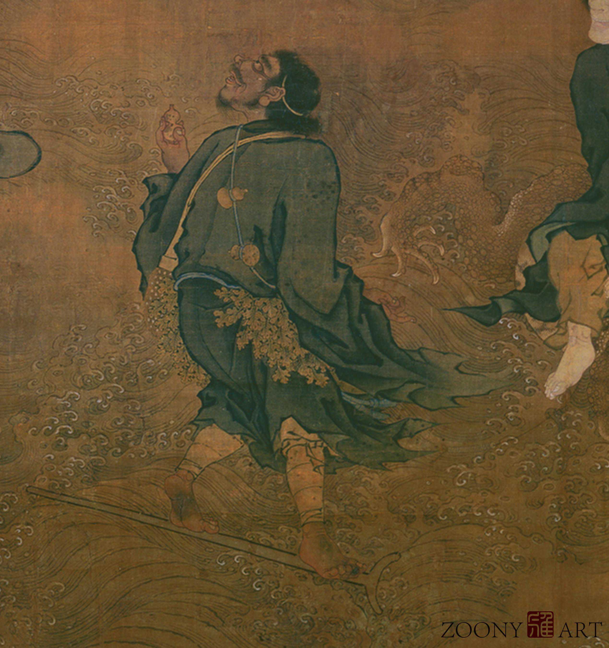 祝寿是古代绘画中的常见题材,而今天介绍的这幅《四仙拱寿图》就是其中的代表作,本图所绘皆为佛道人物,其中的故事情节为何,仍有待考。图中四位仙人凌波渡海,拱望寿星南极仙翁驾鹤凌空。其中趺坐在三脚蟾蜍上,似为全真教五祖之一的刘海蟾;脚踏拐杖、身系葫芦者为李铁拐;另外二人,一足踏竹帚;一足踏蕉叶,似为狂颠禅僧寒山、拾得。画中人物表情生动,如在对语。袖摆衣角随风翻飞,衣描线条顿折有力,而波波滚动的浪涛运用战笔描绘,更显得劲利壮阔,本幅笔墨精细,如同出自宋人之手,是一幅细谨的吉祥画。