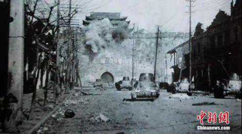资料图:1937年12月12日下午,日军八辆坦克排列南京长干桥南街,集中轰炸扫射中华门。(翻拍)中新社发泱波摄
