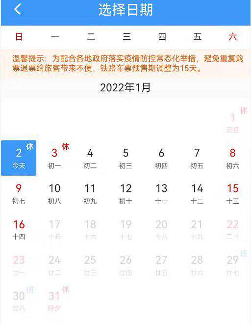 1月18日,可购买正月初一(2月1日)的火车票;