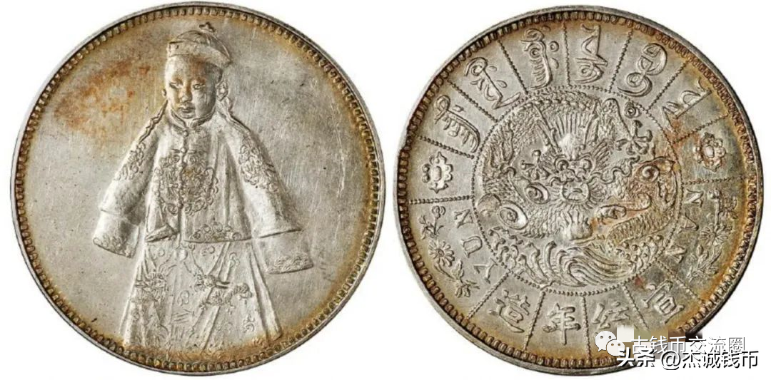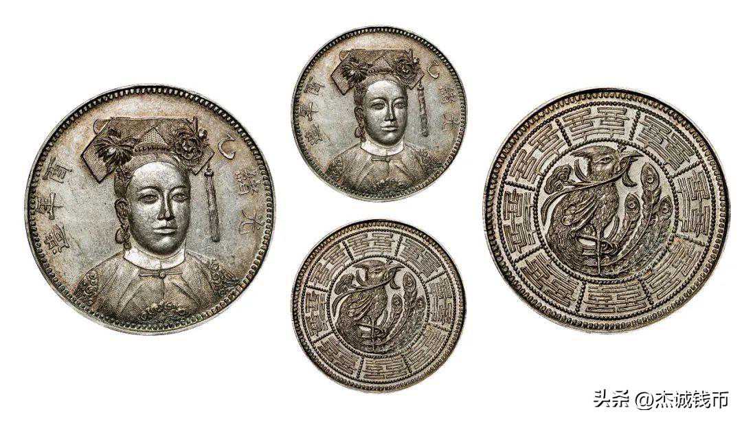 光绪十五年(1889年)岁次己丑,正月二十日举行光绪皇帝十几岁大婚庆典,慈禧太后“撤帘归政”,银元正面慈禧太后像,珠圈外凤凰牡丹图,,下缘“云南恭进”,背面为五蝠(五福)图纹,这枚银币与光绪像福建恭进银币版式相同,只是帝、后像和背面图文有异,应该是同一时期私造赝品银币;上面这枚在SBP2021年香港拍卖中,以43200美元成交,折合人民币约27万;