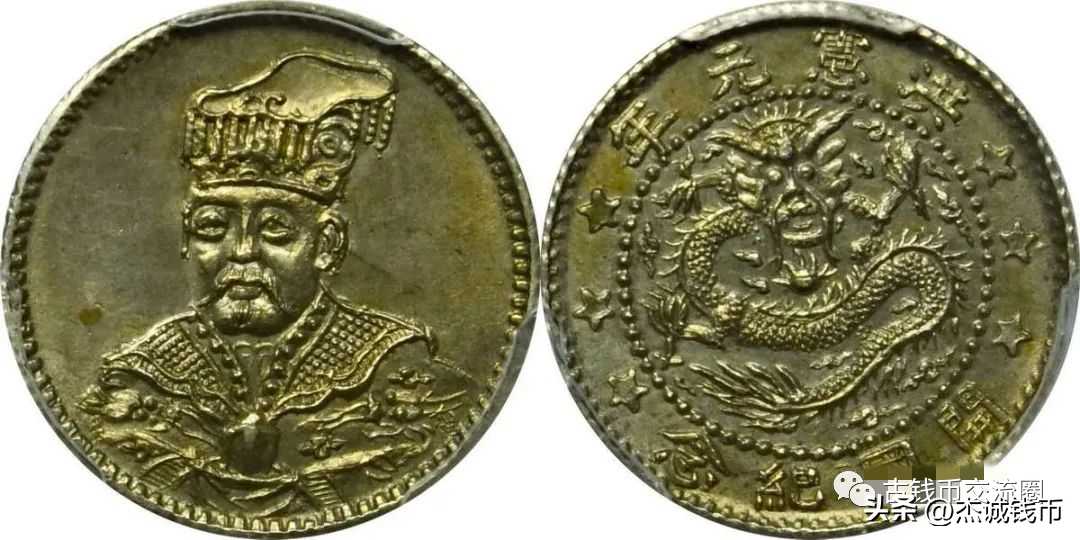 银币面为宣统皇帝登基像,背面为大清蟠龙纹,周环珠圈,上缘满文为“大清宣统元宝”、下缘“宣统年造”四字,两侧饰花星纹,币边齿纹;其币型种类分一元、中元、二角三种。
