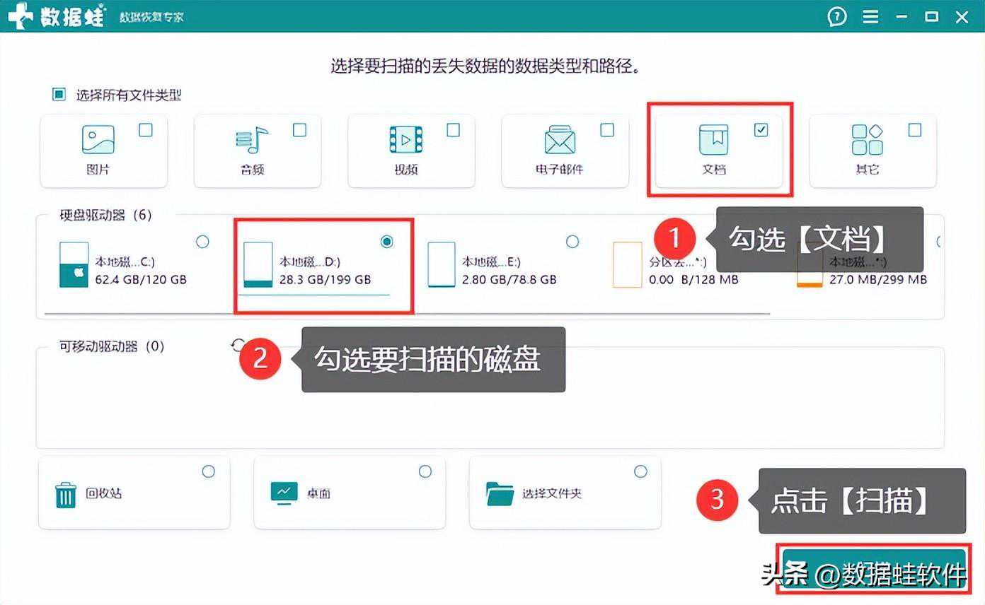 步骤2:对所需扫描的文件类型进行勾选(勾选【文档】),并对所需扫描的磁盘进行勾选(文档删除前的保存磁盘),单击【扫描】;