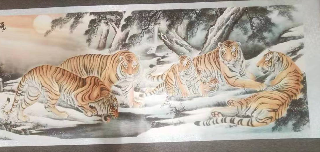 此幅《九虎图》长319cm,宽89cm,画横轴中九只老虎均神态各异,或观望,或聆听,或戏耍,或饮水,不失山中猛虎、水中蛟龙之本色。右侧四只老虎半躺于地,悠闲自得,中间两只在一处水潭旁边,其中一只正在饮水,还有左侧的三只立于一边,目视着前方,他把九虎神态勾画的淋漓尽致,眼神锋利,炯炯有神,意态动人,尽显威猛兽王之霸气,故此画具有极高的投资和收藏价值。