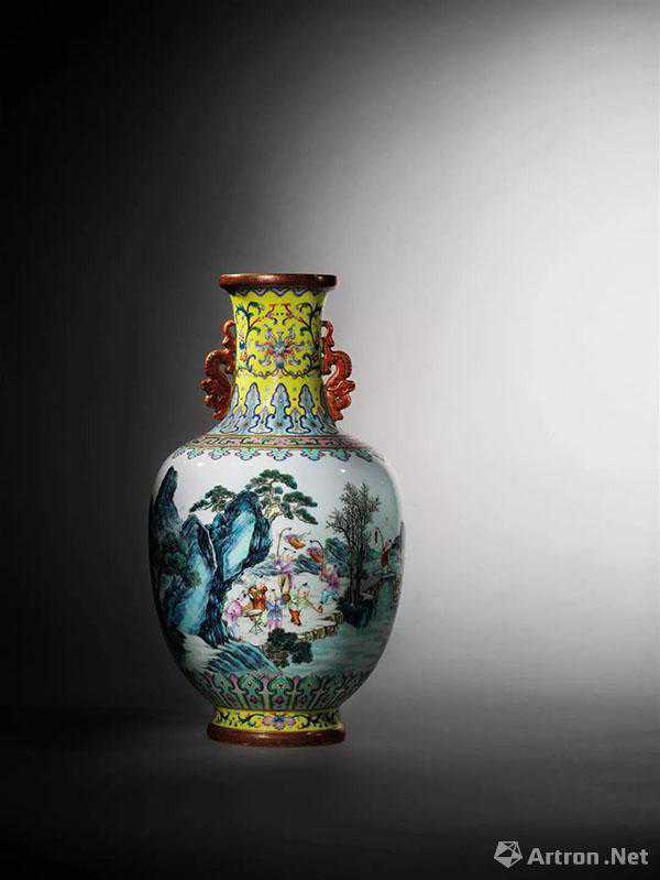 清乾隆洋彩黄地轧道莲纹婴戏图龙耳瓶矾红六字篆书款