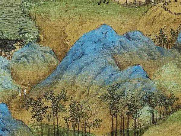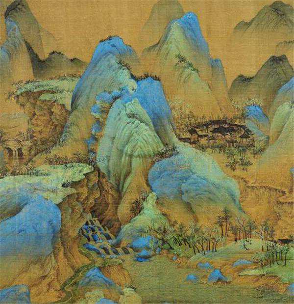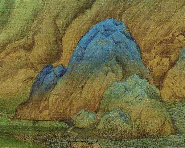 远山与中景过渡部分,仍用石青石绿画出,在天地交界部分,则以花青和墨染出,以示远近。