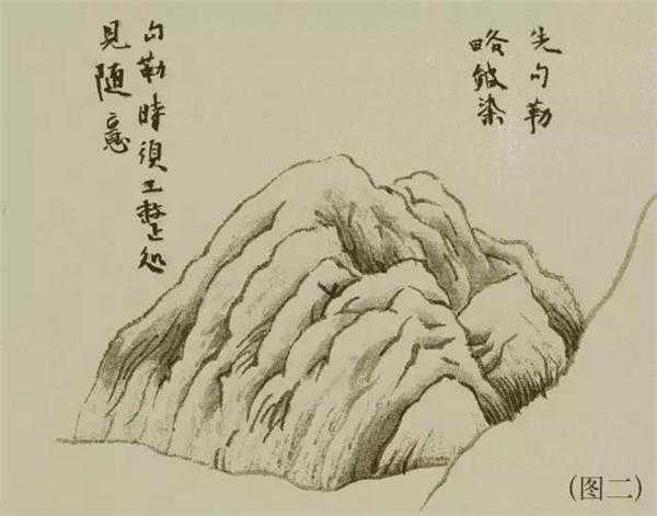 1、勾勒法:先以较淡墨勾勒山石的结构与轮廓,并在重要部位或阳面复勾浓墨,使山石结构有上下、远近、虚实之别。用笔须转折、顿挫,严谨中有变化。(图二)