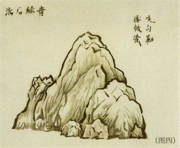 2、皴染:在山石结构的阴面以淡墨加皴,阳面少皴,多以披麻、丁头皴为主,间有斧劈皴,紧要处以淡墨染出结构、皴染后墨气须清,忌污垢。(图四)