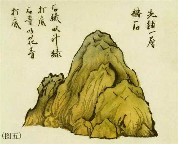 3、铺底色:在山石结构里以较淡赭石铺上三次,切忌一次上足,否则绢面会有粉灰气,并将墨底破坏,每次须等到快干时再上。然后,要画青石的在阳面先敷上一层花青,画绿石的在阳面先敷一层汁绿,并留出根部赭石的暖调子。(图五)