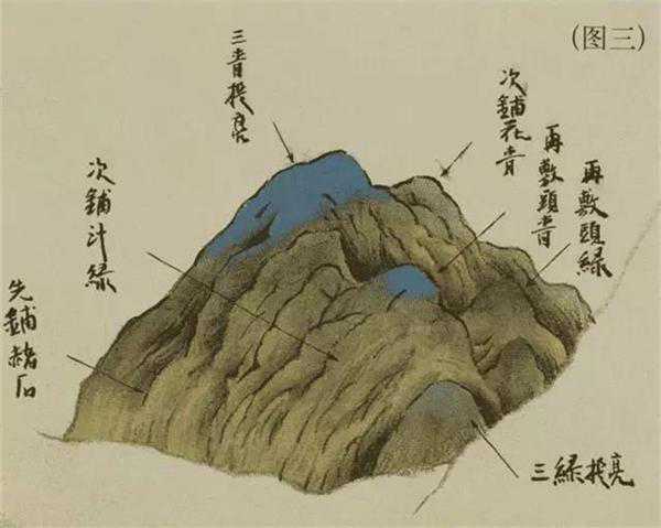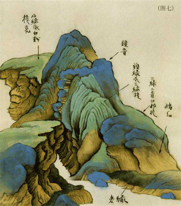 由于此卷以青绿色为基调,且山石在画面中占有极大的面积,因此,掌握山石设色的方法至关重要。