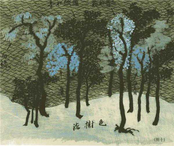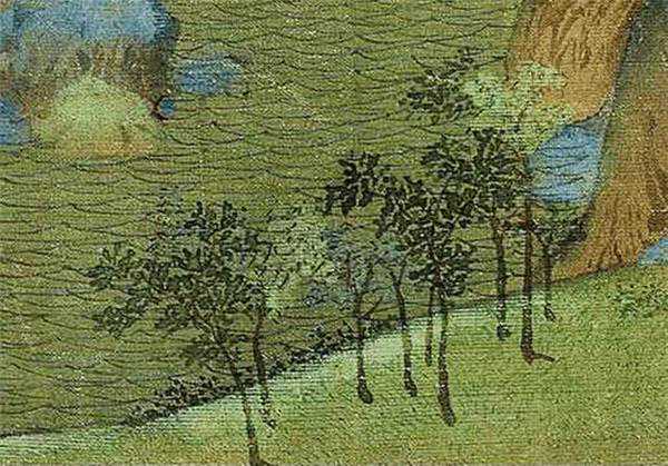 此卷树木多为没骨,偶有双勾,但树身多以墨色为主,树叶则以颜色画出。