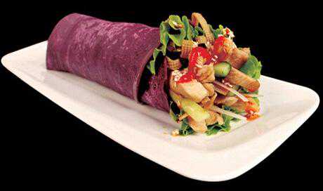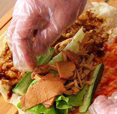 卷饼:将炸好的饼刷上一半黑酱,刷一半茄汁,放适量青瓜少量葱丝,加入主料,卷至一半的时候从后面折一点。卷成细卷,加上卷饼纸。