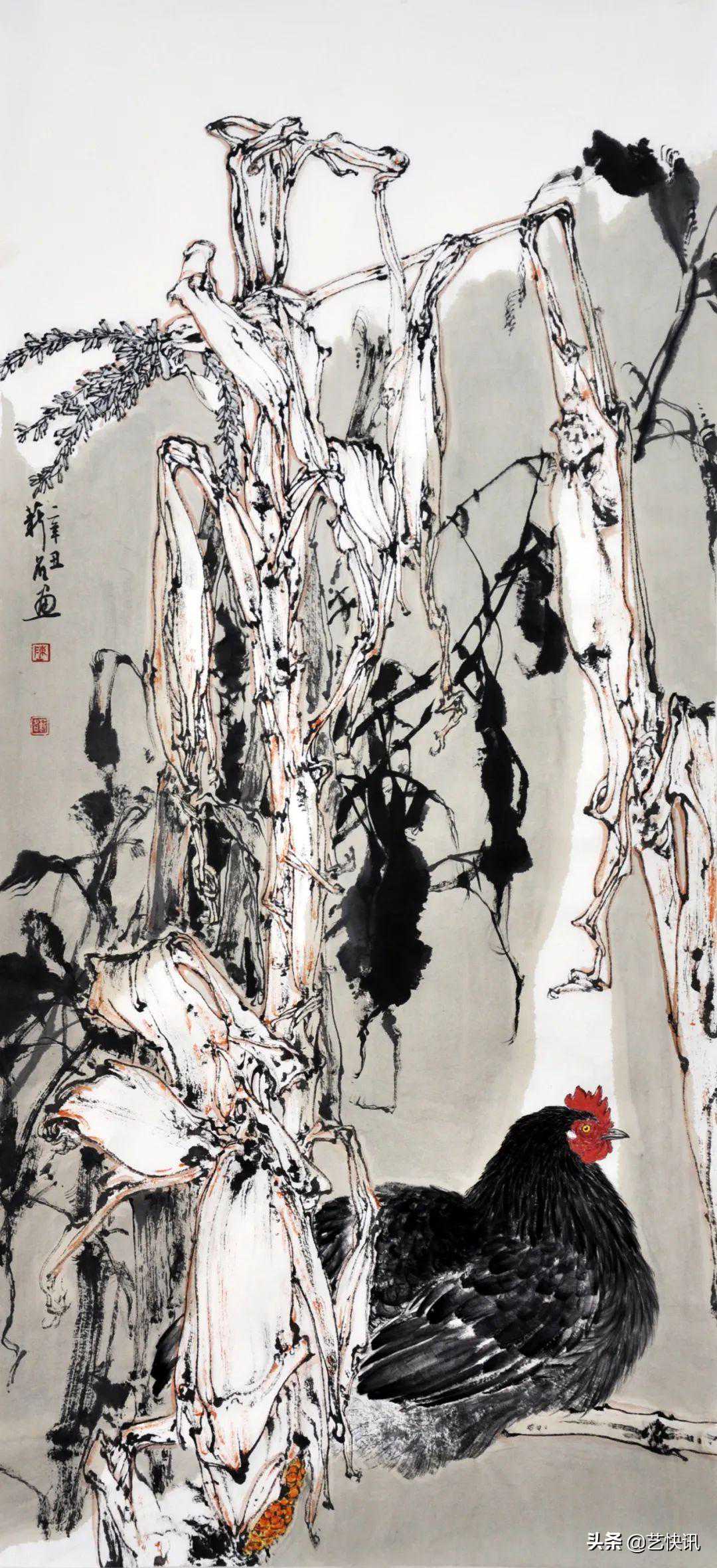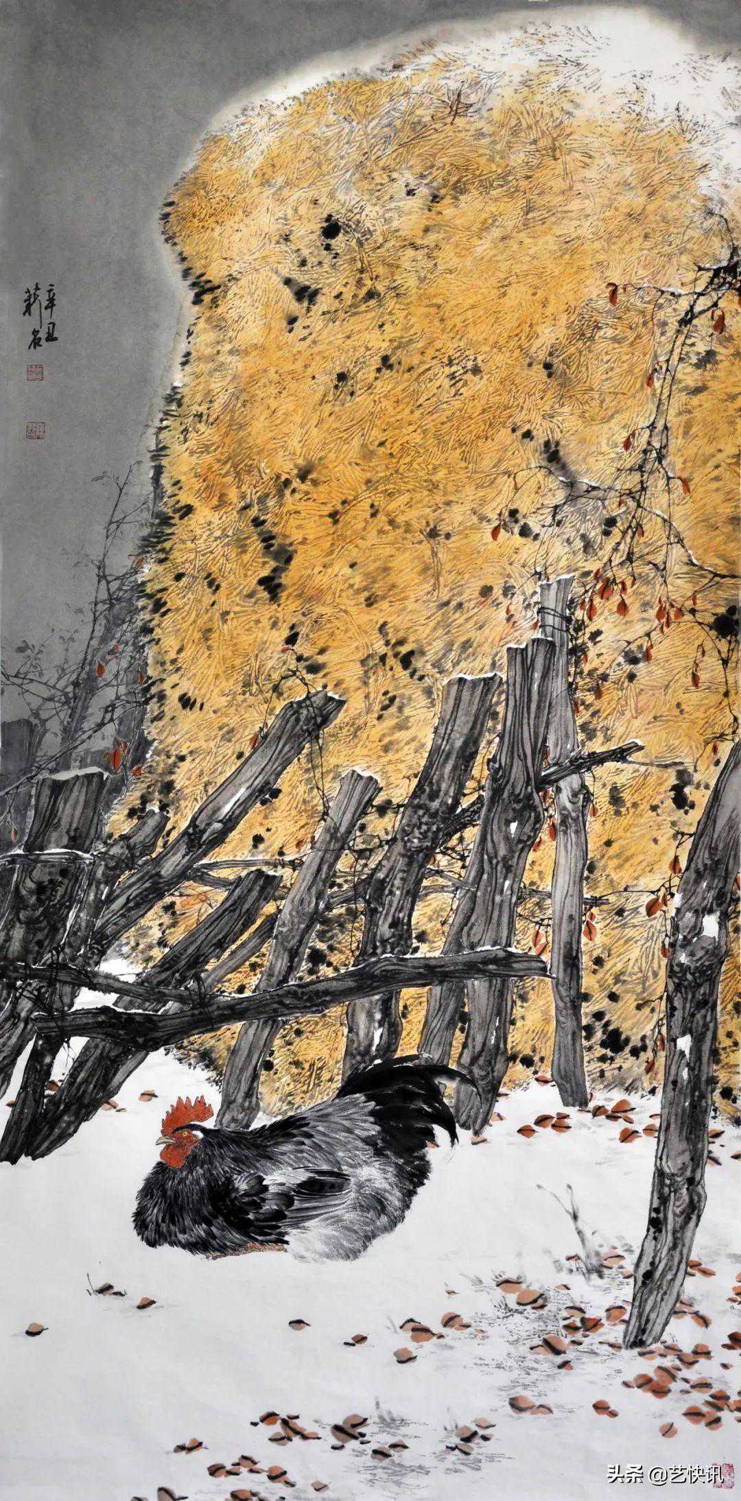 近几年,陈薪名的创作偏重于对家乡素材的挖掘,通过深入生活,观察、体验、联想、感思,通过手写心记的写生方法去搜寻花鸟画创作题材,用现代人的审美情趣去发现、捕捉自然界中所蕴藏着的美,发现深邃的意境、美好的形象和艺术形式,创作了许多闪耀着鲜活生机的好作品。陈薪名的作品取材在我的老家农村随处可见,一花一草似乎都很平常,但他却能在平淡中发现其中的美感。在作品《乡雪》中,淡黄的柴草垛上落着清雪,一枝藤萝倾斜而下,缠绕在篱笆墙上。他用大写意中破墨技法,化实为虚画出草垛,然后用墨勾勒出篱笆墙,一只雄鸡趴在初雪的地上,享受这难得的宁静。这样的情景在我的家乡随处可见,但画家敏锐地发现了这一幕,而又采取恰当的表现形式转达给观者,展现出艺术之美。