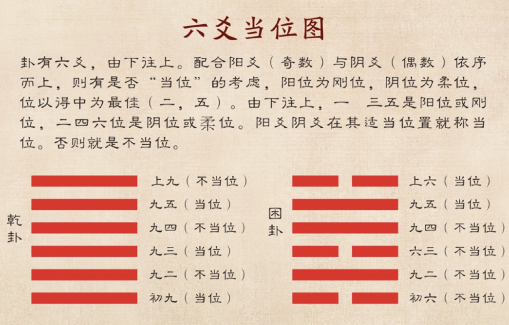 阳爻在初、三、五的位置为当位;阴爻在二、四、上的位置为当位,反之为不当位。