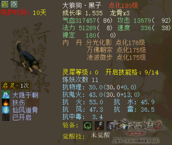 这一只就比较实用一点,是一只血攻野狗,带上了分花拂柳技能,竟然还开启了40点的灵犀,技能格进度也是14/14,只能感叹道有钱任性。