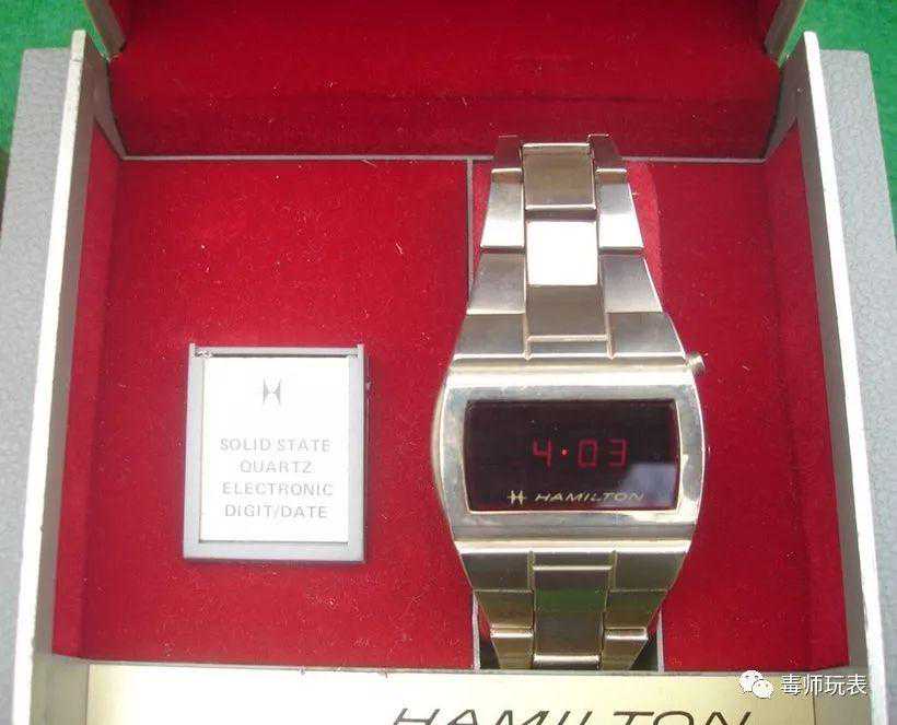 1970年汉密尔顿研发出世界上第一款数字型显示的电子手表,名为PulsarTimeComputer(脉冲星时间计算机)。这只没有指针,没有表盘的手表,采用一块长方形深红色玻璃,细看里面有排列整齐的白色小点