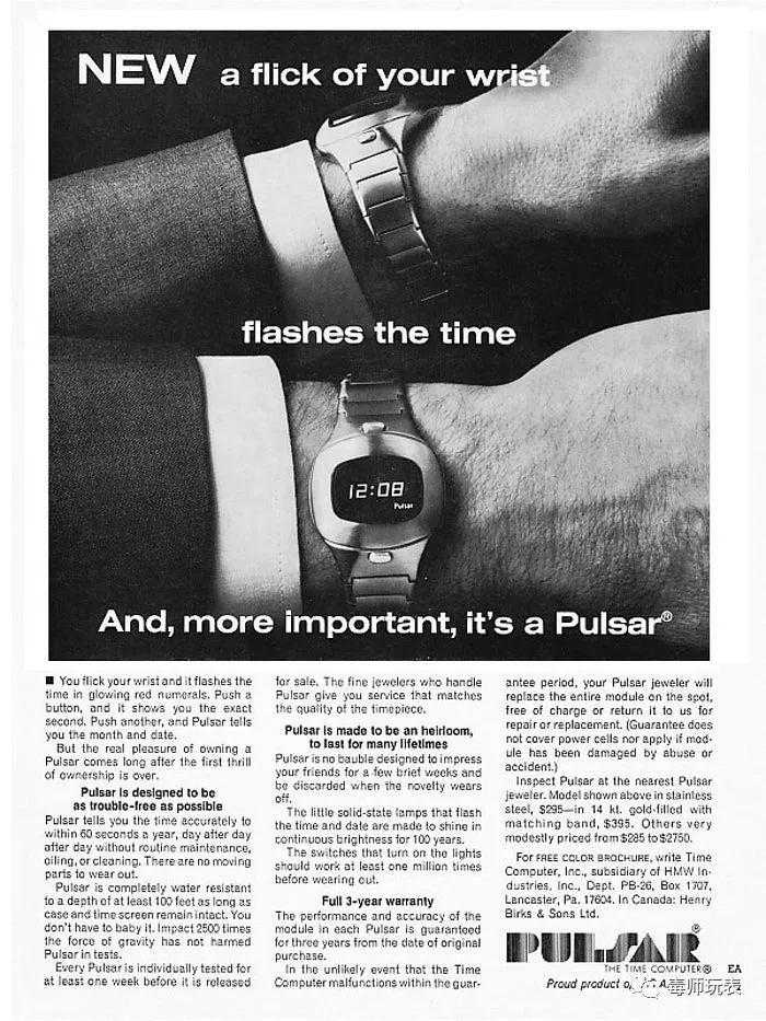 这只采用发光二极管(LED)屏幕显示的电子手表,可以用震惊全世界来形容。最初发布钢款售价竟高达2000美元以上(可以买一部高级汽车),要命的是还一表难求。加上当时美国太空竞技的大环境下,人们对电子表的热情高涨。大家都以能带上一只Pulsar为荣,都对此表深信是未来的趋势。