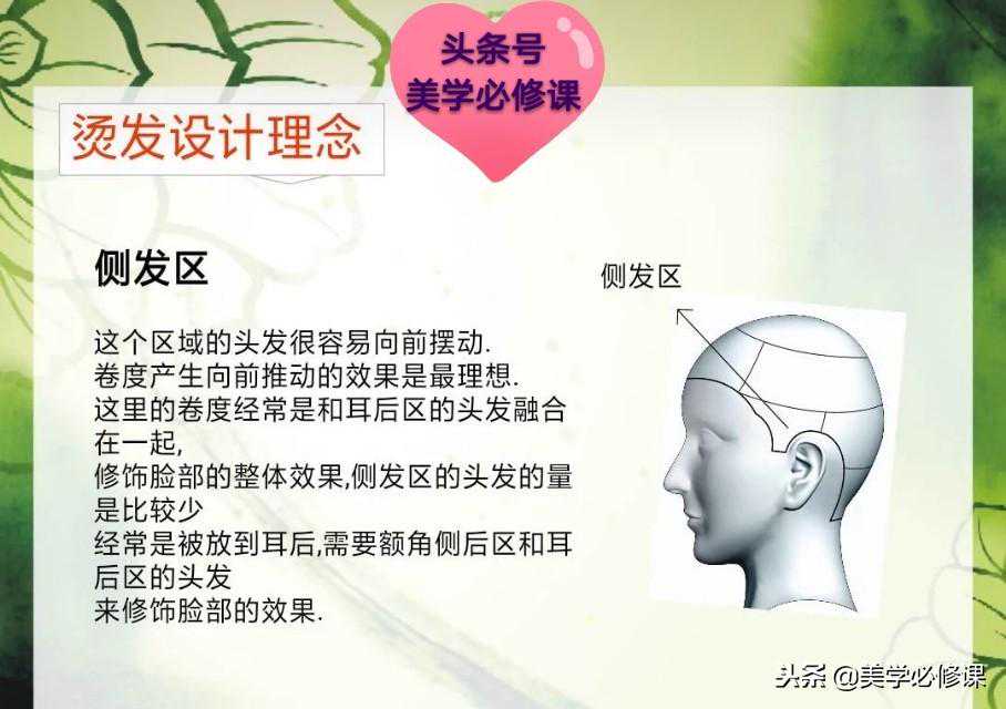 这个区域的头发很容易向前摆动卷度产生向前推动的效果是最理想这里的卷度经常是和耳后区的头发融合在一起。