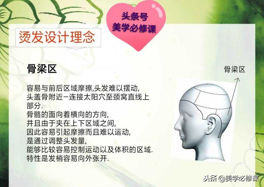 每个分区都是代表每个区域的不同的特点在烫发时采用各个不同的方法,来完成整体发型的效果。