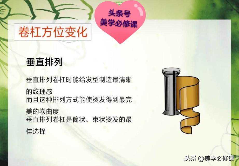 是在头部以垂直分线,纹理自然,发根比较不松散以竖分发片卷杠提升的角度和卷杠发片和发片之间的距离,对卷度都会有影响。