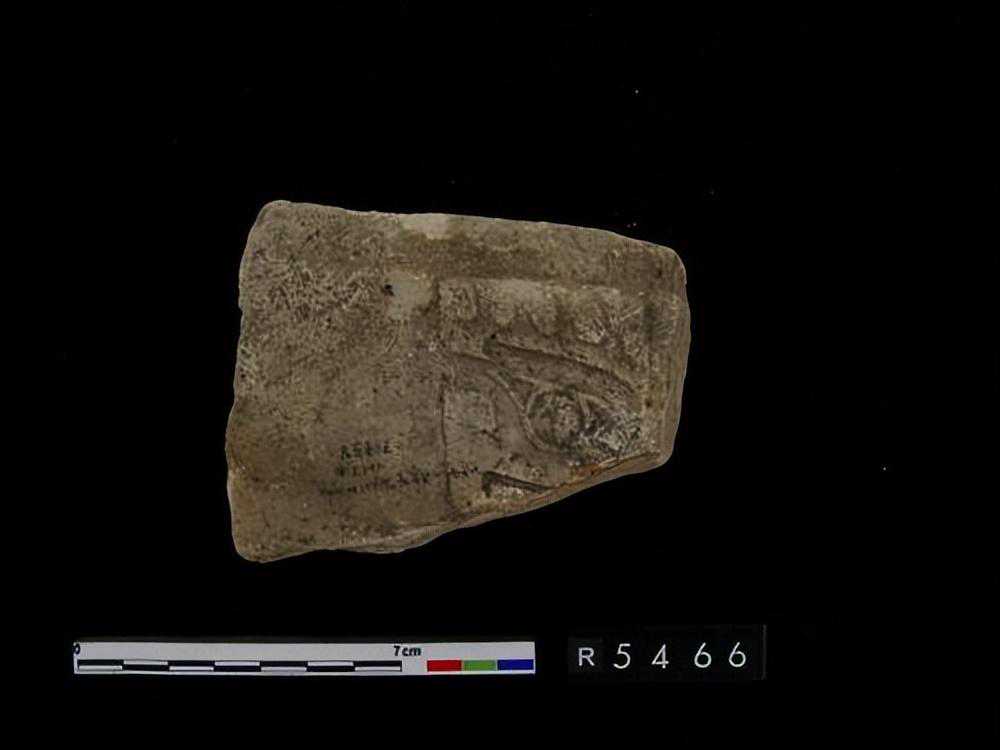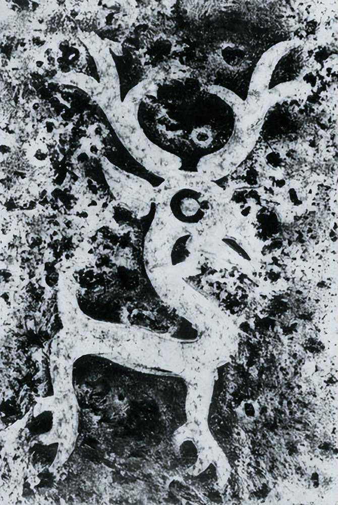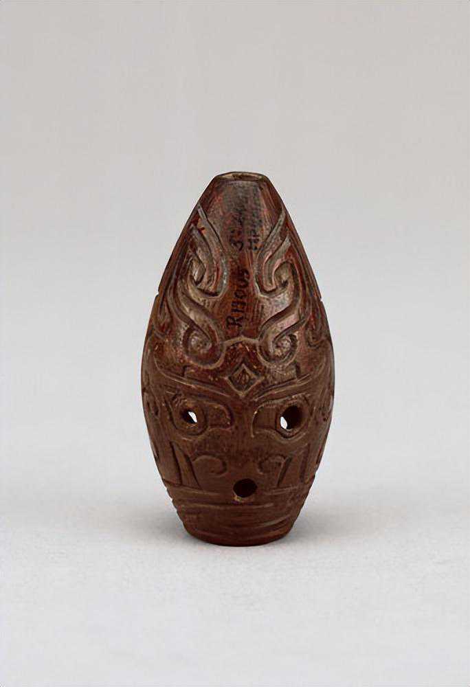 为一平面雕刻,背凹而面略凸,头上两角属曲,两旁有两小耳,双目圆睁鼻大,下为一槽,形极狞恶,色白,有涂硃痕。