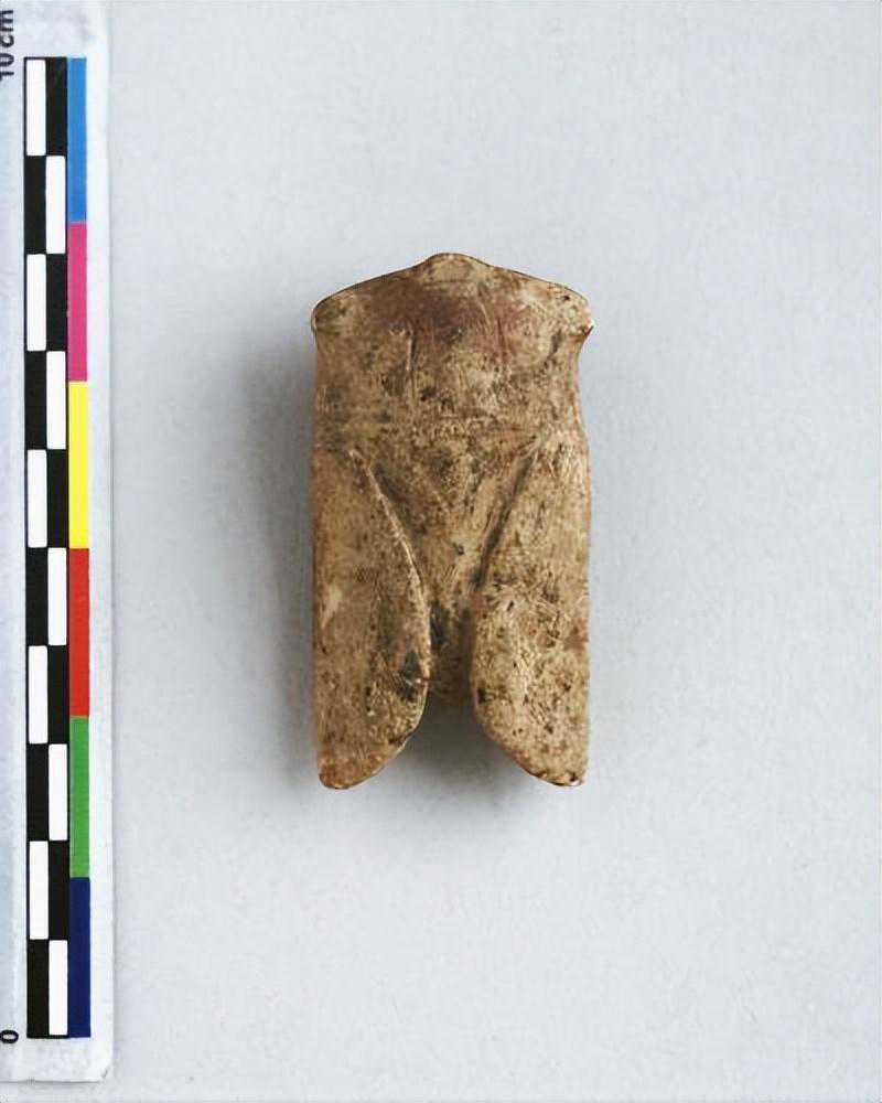 牛形立雕,口微张如一长条,头上两"臣"形眼,鼻刻为"()"形,眼后为一对弯角,曲伏于背上,表面上刻有简单文饰,下为两小耳,仅有阴纹表现,背部近平,四足略具形式,有短尾,色灰白。