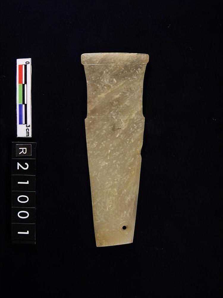 灰色长方形小石斧,两端均向内协中间有一原穿孔,表面经搓平,部份剥蚀失原来石皮,一面平齐,另一面则向刃部逐渐减少,刃部完整,偏锋。