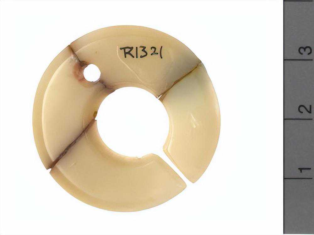 中有孔,连一缺口,似玦而椭圆,色淡绿。