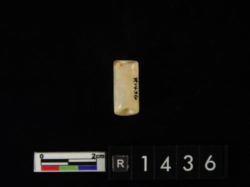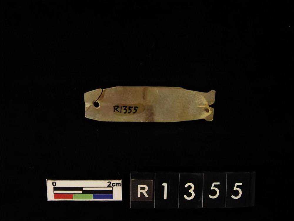 器为弧状,两端有孔,外面刻有带目文之纹饰两组,色白,微有斑。