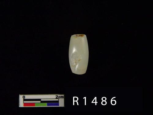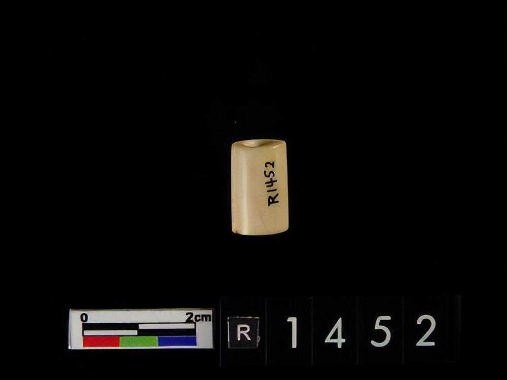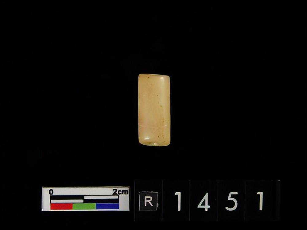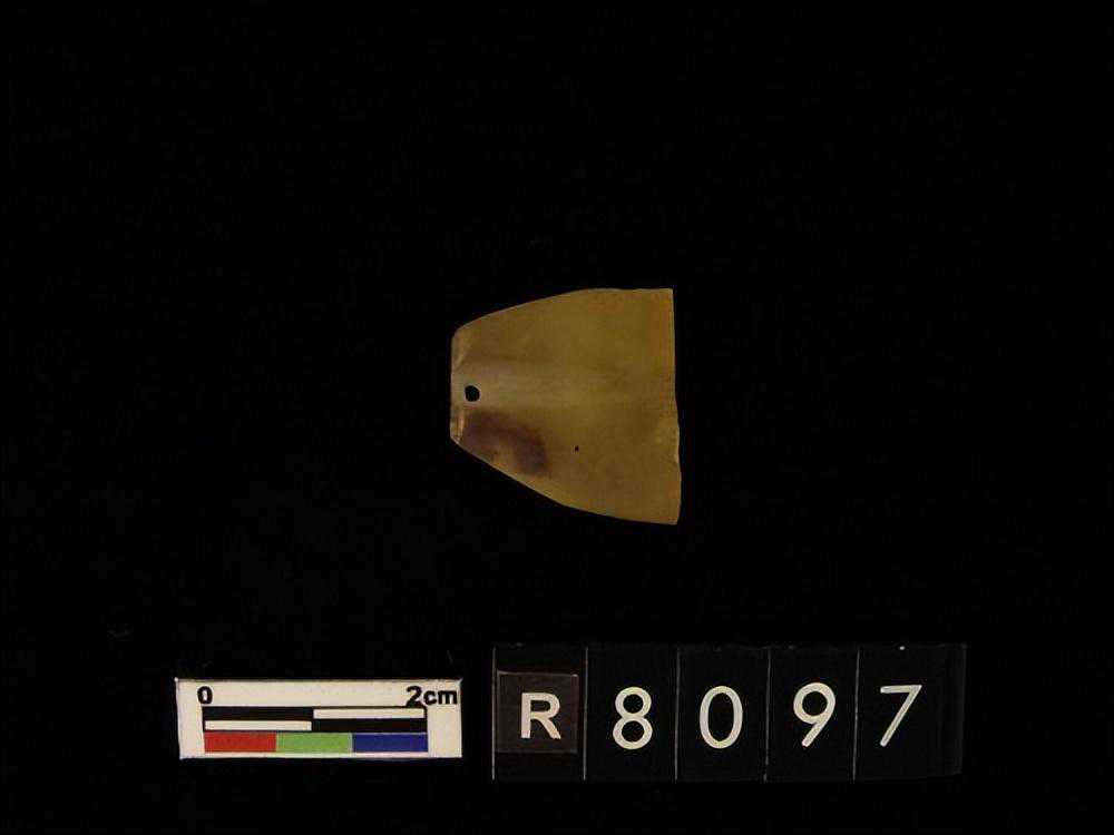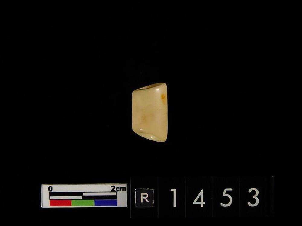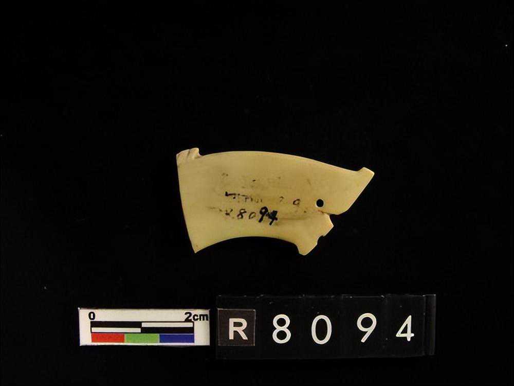 白色残片,表面平齐且光滑,一长边有四齿残存。另一端呈断裂面,残存有一圆形穿孔痕,表面部份呈剥蚀粗糙面。