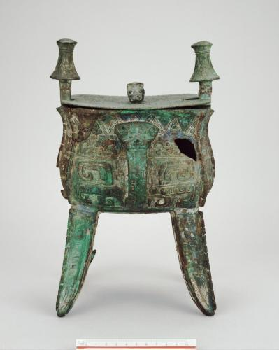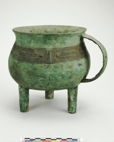 颈饰兽面纹之穿耳二个及大兽面二组,其下为三角雷纹及兽面纹,足兽面纹及雷纹一圈。间有蓝色。有铁痕。圈足有孔二。