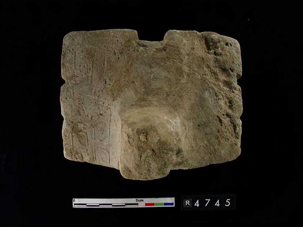 立体雕刻,上宽厚,下窄而稍薄,近梯形,头面具高浮雕之眼鼻角及耳,口大张如长方形槽,无齿,臣形眼,眼珠凸出,上为阴绞钩眉,再上为心形角,两侧有耳,下有阴线纹饰,右耳残缺,头顶似为一甚宽之槽,底平,多处风化剥蚀,鼻残缺,似为凹形,色灰黄。