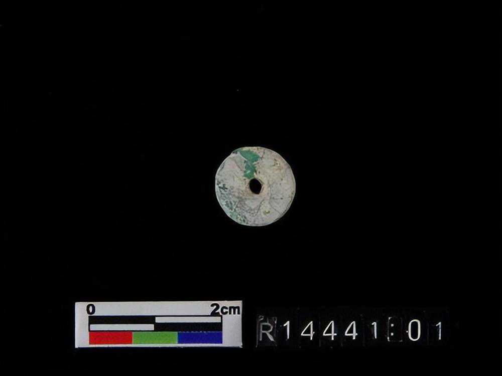 色灰白,杂绿斑,形式同1550-40墓里出的玉凸边璧(R00912)。