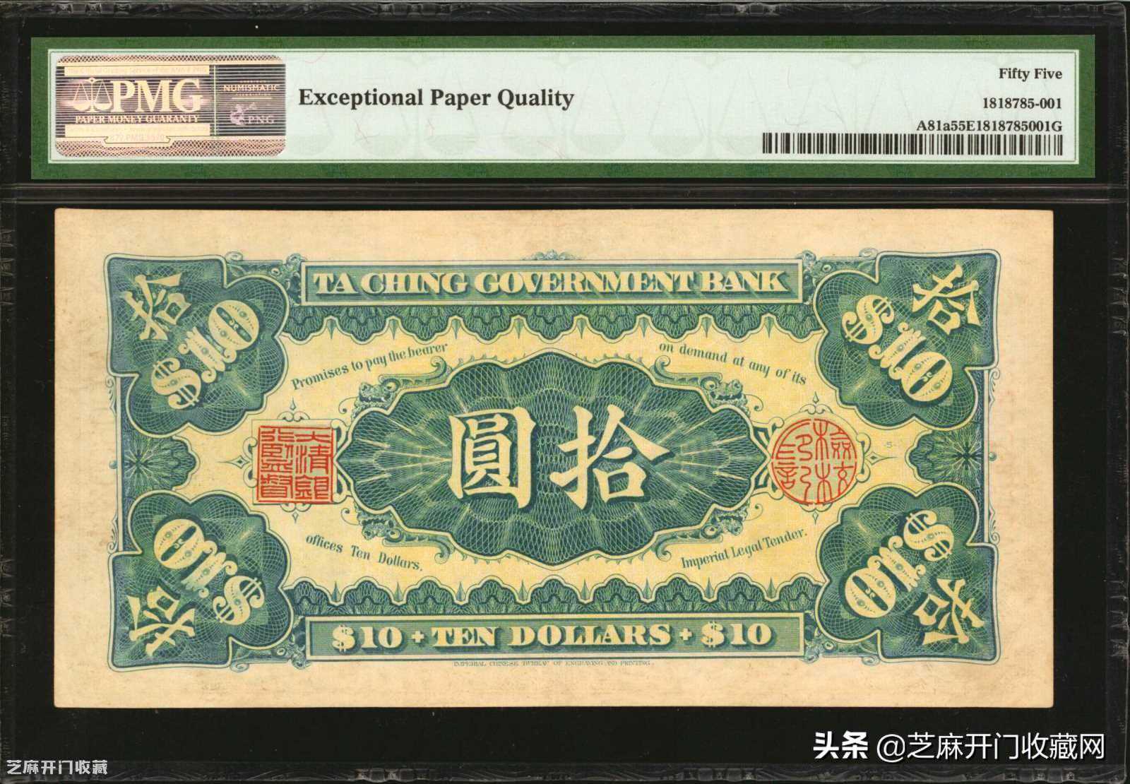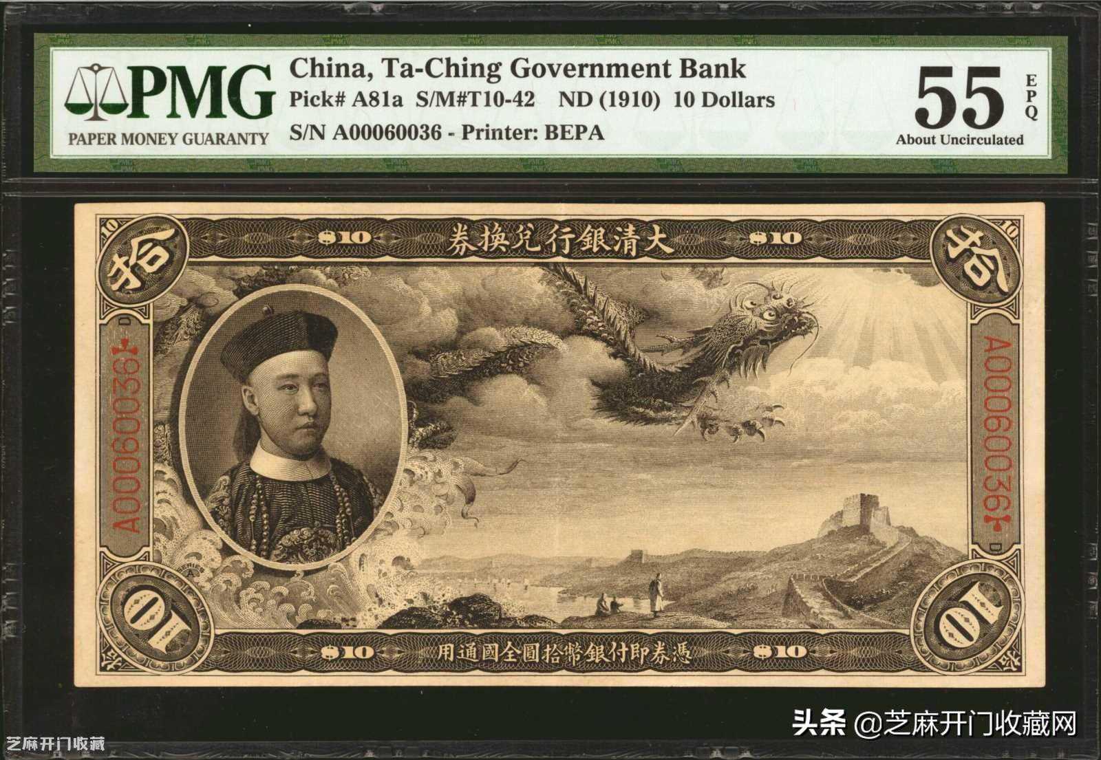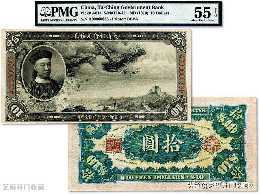 2:宣统二年大清银行兑换劵拾圆PMGAU55,估价:USD20000-25000,成交价格:USD60000